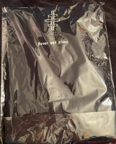 BLACK T-SHIRT and has the “NEVER END PLACE” on the front. Black background.