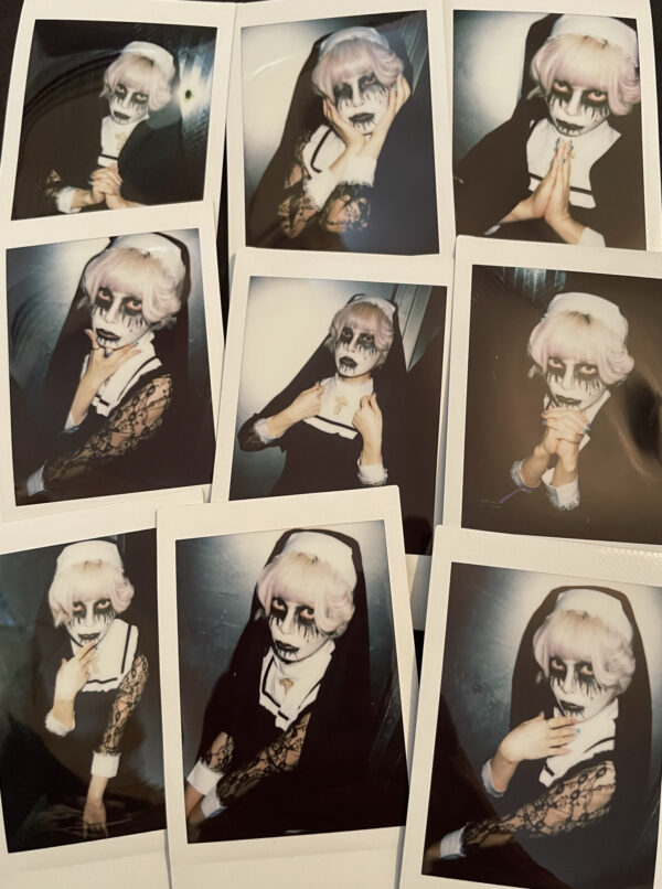 One random cheki (business card sized instant photo) of Michelle from The Devil’s Killing Merry-Go-Round dressed up in a Nun costume with corpse paint outfit! Order as many as you want!